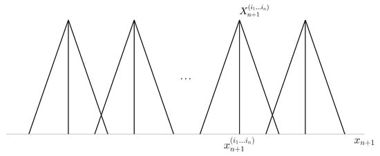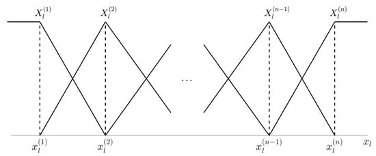 In the continuos case, . It is assumed that is a fuzzy set for input . is the number of fuzzy sets for , and are the corresponding membership functions (see Figure 1), which are overlapped by pairs. This means,