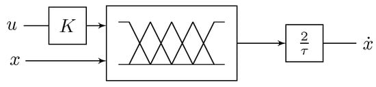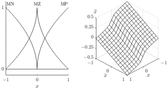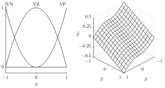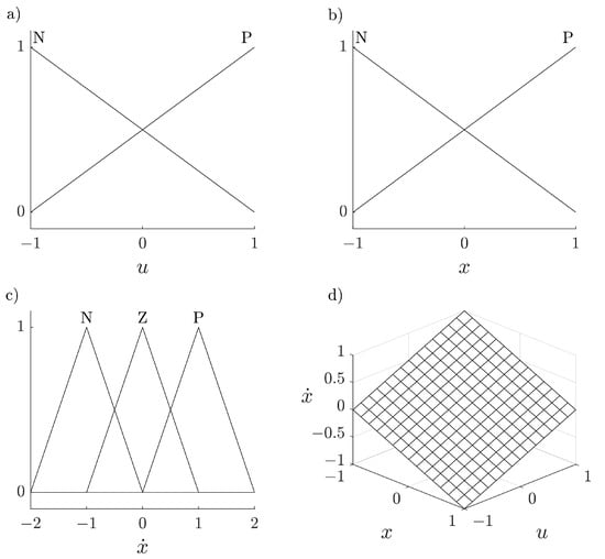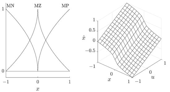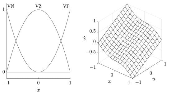 Once the model has been adjusted, a dynamic analysis is performed on this first-order system for input u, and there are two fuzzy sets for , , , as shown in Figure 9.