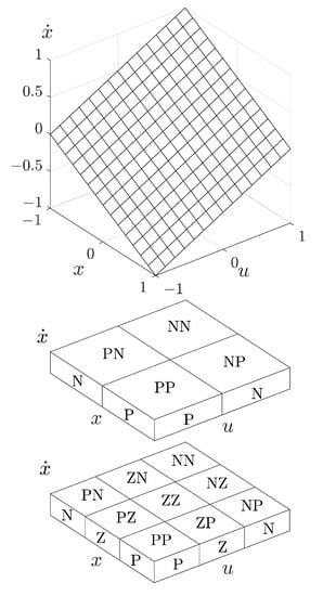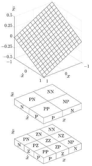 A fuzzy dynamic model equivalent to the linear second-order dynamic model can be obtained by using the following logical operators in the fuzzy inference process; the product for conjunction, the product for implication, the sum for aggregation and the centroid for defuzzification. These operators are used so that the output of the fuzzy system is linear. In the second-order model, we obtain that , , , , and can be approximated. Another important thing to consider is the universe of discourse, which can be obtained from the phase plane.