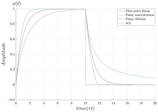 The response of a unit step using linguistic operators, concentration and dilation are compared to a first-order linear system in Figure 8. This graph indicates that the settling time () is less than that of the first-order linear system in concentration, which implies that it is faster than the first-order linear system. On the contrary, the in dilation is higher than that of the first-order linear system. Therefore, the system is slower compared to the first-order system. This is valid only for the first 10 s. After that, it is observed that the dilation is faster than the concentration.