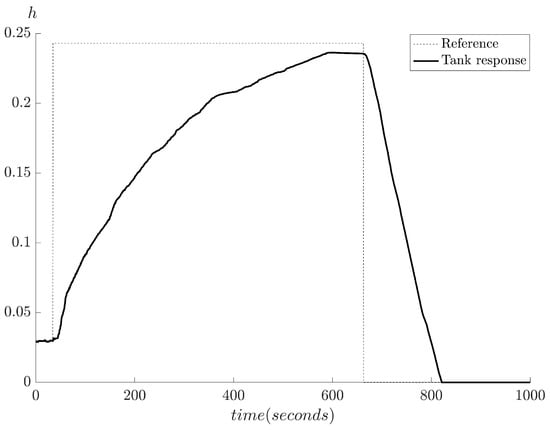 To calculate the settling time for the step-down where the level is initially set as m, the inlet flow, , is replaced in (33) to give us a height of m. Equation (17) is then used to calculate the settling time.