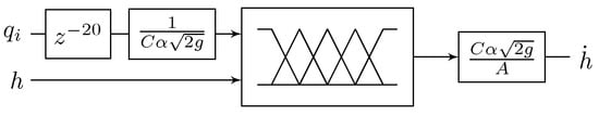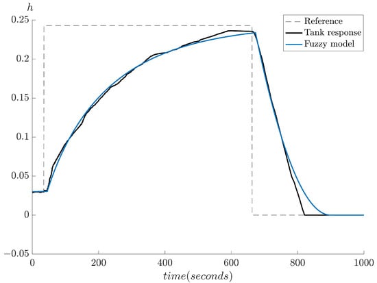 This model coincides with the tank model in the standard form (Equation (34)). The fuzzy model output is shown in Figure 22.