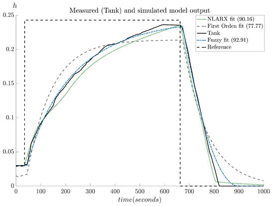 The performance of different models is compared. Time delays in the identification of processes can have a significant impact. For systems with time delays, there are several models proposed. The non-linear ARX (NLARX) model is a flexible non-linearity estimator with parameters that do not need to have physical significance, commonly used in time series modelling. This structure employs a wavelet or sigmoid function to model complex non-linear behaviour [41]. NLARX models can also be estimated using MATLAB System Identification Toolbox. As shown in Figure 23, with the fuzzy model (in blue) has the best performance, with , followed by the NLARX models (in green), with a performance of and, finally, the first-order model (in grey) with a performance of .