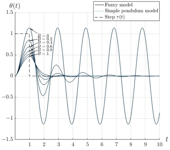 The result of the fuzzy model applied to the simple pendulum can be seen in Figure 27. The graph was elaborated upon using different friction coefficients: B = [0, 0.2, 0.4, 0.6, 0.8, 1], kg, m and m/s. It was also compared with the dynamic model.