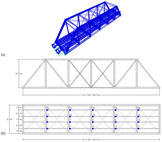 The current study initially investigated a multi-span, in-service, steel railway bridge in central Nebraska, with a simply supported truss span being the focus. The bridge carries two tracks and its geometric and material properties are explained in more detail elsewhere [14,22]. The studied truss span is 44.7 m long and includes six panels. The floor system consists of timber ties resting on stringers that are connected to floor beams. The floor beams, in turn, distribute loads to truss lower chord panel points. Stringers are spaced 2.15 m center-to-center with tracks spaced 3.95 m center-to-center. Isometric, plan, and elevation views of the examined truss span, which also details instrument locations used for field testing, are shown in Figure 1.