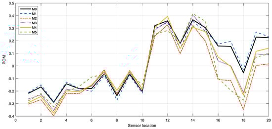 Strains from each model scenario in Table 1 were stored in a snapshot matrix and used to extract POMs. Healthy POMs were calculated from the snapshot matrix for each simulation using SVD, and the first POM was then extracted. The first POMs for were trained for damage identification using ANN [14]. In this study, simulated experiments to from Table 1 were trained for damage scenarios using as feature, and the estimated first POMs were calculated at each location shown in Figure 1 using the developed framework from Rageh et al. [22]. Figure 2 plots the average of the first POMs for the different models, each without imposed damage. These plots indicate that the presence of MU at different levels in the FE model affect the first POM variations and necessitate the use of a TL approach for transfer knowledge across different simulated experiments. These POMs were used as features in the TL algorithm, as discussed in the following section, using the JDA–kernel method. The JDA–kernel’s ability to map trained knowledge from to other targeted models was then evaluated.