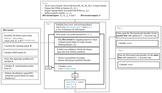 Cross-validation of the JDA–kernel algorithm was implemented using the k-fold method [39]. Four partitions were used, with one partition being reserved for cross-validation and training being carried out using the remaining three partitions. Hyperparameter tuning was also implemented using the grid search method [40] to find optimum values for the number of transferred components () and the regularization parameter () used in each simulation. Figure 3 details the TL process. As illustrated in the figure, the process consisted of four steps. Preparing features and defining source and target models were addressed in Step 1. JDA–kernel implementation, cross-validation, classifier training, and hyperparameter tuning were implemented in Step 2. In Steps 3 and 4, the JDA–kernel and classifier were reimplemented using partial data and entire data sets, respectively, from optimized parameters obtained in Step 2. The score in Step 3 and 4 represents the calculated mean accuracy of the JDA–kernel and classifier by applying the optimized parameters in the algorithm.