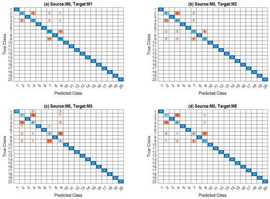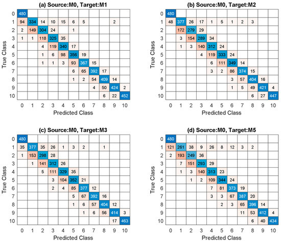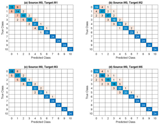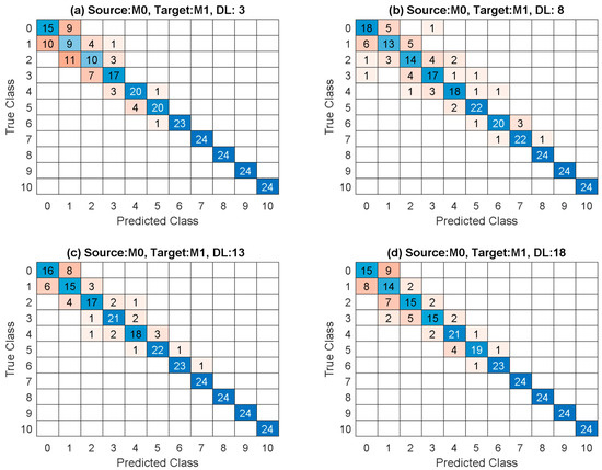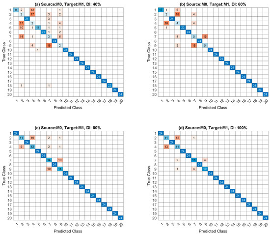 Prediction results for DIs of 40, 60, 80, and 100% are shown in Figure 5. was arbitrarily selected as the target model for all cases as M1 results were representative of other models. As expected, JDA–kernel accuracy increases in higher DIs, with similar DL prediction patterns being observed, as for the confusion matrices shown in Figure 5. Table 3 summarizes JDA–kernel accuracy results in at different DIs. The table details improved accuracy for higher levels of DI. Similar patterns were observed for the other models.
