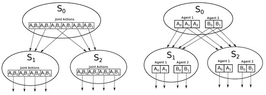 On the left, the search tree of UCT with the joint actions. On the right, the search tree of decoupled-MCTS with nodes having different set of actions for each agent separately.