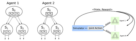 - Czechowski, A.; Oliehoek, F.A. Decentralized MCTS via learned teammate models. In Proceedings of the Twenty-Ninth International Conference on International Joint Conferences on Artificial Intelligence, Yokohama, Japan, 7–15 January 2021; pp. 81–88. [Google Scholar]