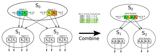 The method uses the statistics from decoupled-MCTS to decide how actions are going to be selected for combining. We sorted individual actions by their selected statistics and chose them to be part of a joint action one by one randomly. This reduced the complexity such that we did not need to construct all possible joint actions. If we used the average cumulative reward as a statistic, in Figure 5, we chose and as the first candidate. Then, to generate the next joint action, we replaced with and kept the as it is. For that example, we randomly chose Agent 2 to update. After the joint actions were selected we calculated their statistics by summing the cumulative rewards of individual actions and dividing that by the total visits to individual actions. The joint action , has and , had as the cumulative reward. This ensured that the evaluations of individual actions were used to estimate the cumulative reward of the joint action. We set the visit count to 1. In this way, we could incorporate the statistics of individual actions to preset the initial action selection. However, because we set the visit count to 1, we gave very small weight to our initial evaluation.