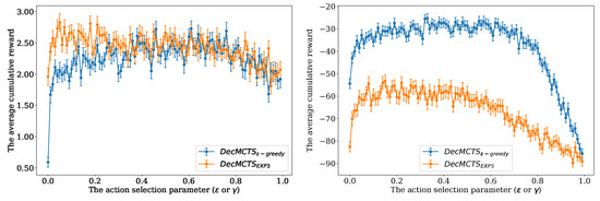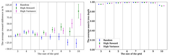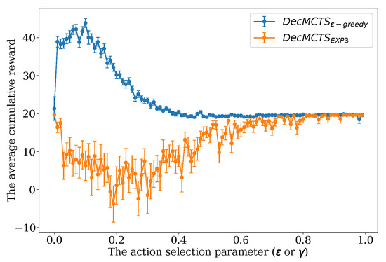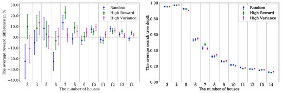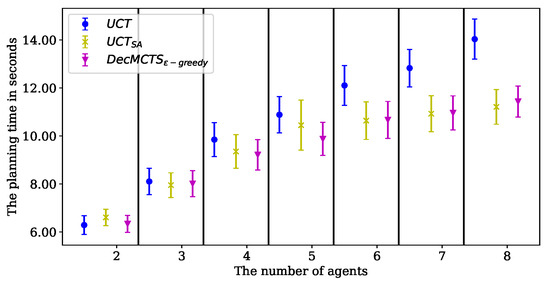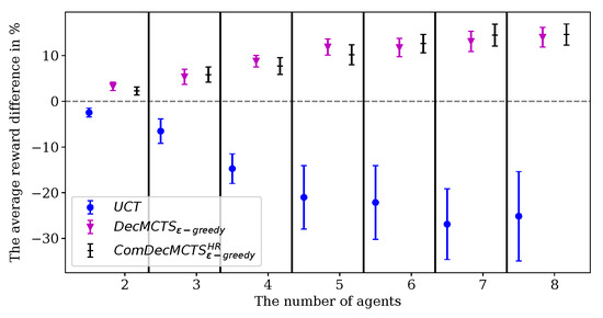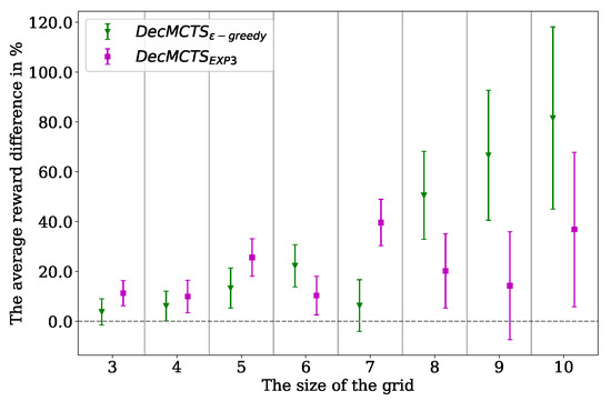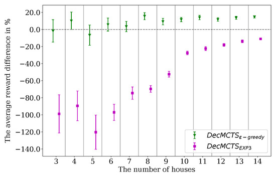 We tested the results for statistical significance using Mann–Withney with . We saw that outperformed for all problems. This was an unexpected result, since we expected a decrease in the performance of as the problem complexity increased, but we saw that was affected by negative rewards. The outperformed for problems with houses from 10 to 14. Similarly, had a higher reward than for all problems. Based on the results, we could conclude that decoupled-MCTS with action selection outperformed centralized planning when the complexity of the problem increased. Finally, we stated that was better than action selection policy for decoupled-MCTS.