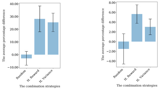 The results of combination strategies for (left) meeting in grid and (right) fire fighting problem for all problem sizes. The results are averaged over the percentage difference of the strategies from . The whiskers show the standard error.