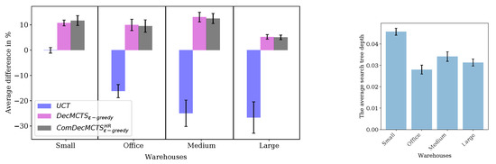 We present the average performance of methods with a different number of agents against the method of Claes et al. [8] in Figure 16. The horizontal line at zero represents the method proposed by Claes et al. [8]. We calculated the average reward for each algorithm for each warehouse problem and the number of agents. Then, we calculated the percentage of the difference to the baseline average reward. Finally, we averaged the percentage values over warehouses. We showed that as the number of agents increased the performance gain increased for decoupled methods. This could be attributed to the situation whereby when there were few agents, there would be more tasks in the warehouse that needed to be served. When more tasks waited to be served, modeling other agents with a greedy method resulted in a good approximation of the behavior of other agents. We showed that for problems having more than 5 agents, the and methods improved the baseline by more than 10%. We also showed that the performance of degraded sharply as the number of agents increased. As the number of agents increased, the number of joint actions at each node increased exponentially. As we limited the number of actions, we dismissed useful joint actions from the UCT search tree. The search tree would be evaluating a small subset of joint actions and result in poor performance. When we compared with , we did not see a performance difference. For every number of agents, their performances were on par with each other, due to the shallow search tree.