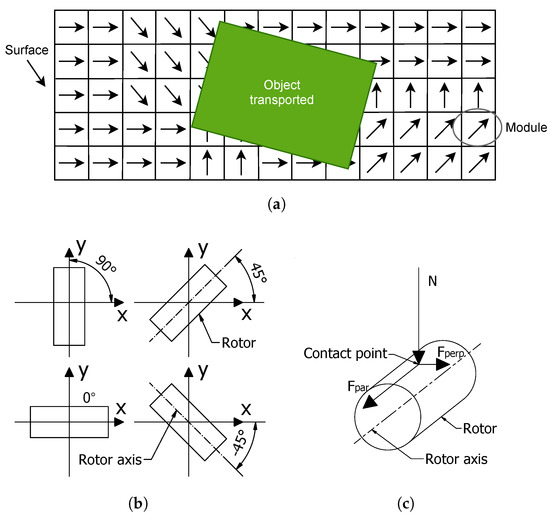 In addition, similar to other active surfaces that use rotors for intralogistic purposes, the application is limited to parts with at least one planar surface, in order to have simultaneous contact with three or more rotors. Another limit will be the maximum load per module, but this is related to the resistance of the device, which is not studied in this article. However, the study conducted is done considering the dimensions of the modules and their resistance comparable with the similar actuated existing systems. To provide a reference, the base of a transported object has the minimum dimensions of cm cm], and the weight bearable by a single module is 20 kg.