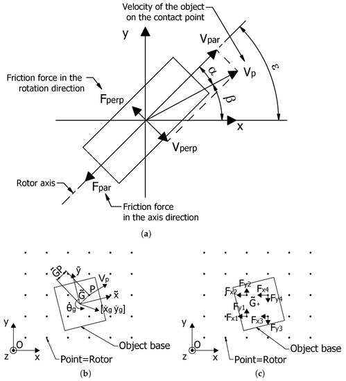 In this subsection, considering the previous assumptions regarding sliding and pure rolling and taking into account that the friction forces oppose motion, the directions of the two forces (, ) and their final formulation are determined. Thanks to the third assumption, these directions are related only to the object velocity at the contact point with the rotor, ; an example is shown in Figure 4a.