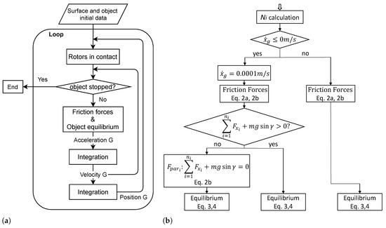 The simulation takes advantage of an iterative loop (shown in Figure 5a) that involves the following steps: initialization, rotor identification, stopping criteria, contact forces and equilibrium computation, and two steps of integration. The initialization of the problem is made at the beginning by providing data from the object and the surface (example: object mass, base shape, initial position and velocity, friction coefficients, module pattern, inclination of the surface, rotor orientations, etc.). After that, the iterative loop can start. For each step (e.g., the sth step), the rotors below the object are identified (thus the contact points as well), knowing the position of the object from the previous iteration (th) and the disposition of the modules (as introduced in Section 3). Once the rotors below the object and their orientation are determined, the object velocity from the previous iteration (th) together with the inclination of the surface are evaluated by the stopping criteria: if “ m/s and ”, the object is stopped because of negative velocity and null inclination and the loop ends. This is true assuming, in general, that the initial conditions always provide an input towards positive x (° or ). When the stopping condition is not reached, the loop continues and the forces in the contact points can be computed (still considering the object velocity from the previous iteration (th)). With these forces, the equilibrium of the body and the accelerations are calculated according to Section 3. Finally, in order to obtain the velocity and the position, two integration steps of the acceleration vector are implemented. The derived values are the input of the next iteration (th) of the loop.