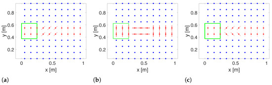 Figure 6 introduces the symbols used in the following sections to display the layouts of the simulations implemented in MATLAB: the red elements correspond to the transport line, the blue dots correspond to the area (array of support points) out of the line, and the green square contour corresponds to the object base. Regarding the transport line, dots represent rotors centers, and lines represent the rotors axes. The red lines before the active area (the green square) are oriented perpendicularly to the flow line and their effect is to reduce in a minimum way the motion of the box in the flow direction, and the inclined lines () simulate the sorting, the slowing, or the stopping surface.