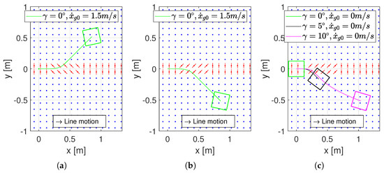 In Figure 7a, the green square and its trajectory show that, with rotors inclined at , sorting towards can be achieved, as the object is shifted completely off the line.