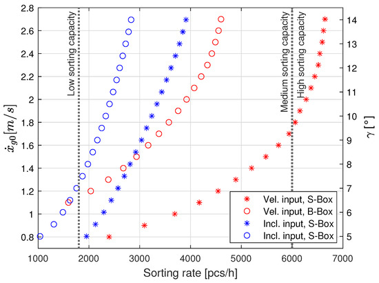 Sorting rates obtained with MATLAB simulations for the “S-box” and “B-box” objects, with, as input, only initial velocity (red) and only inclination of the surface (blue).