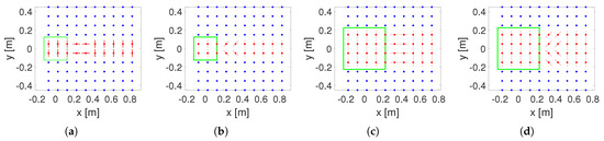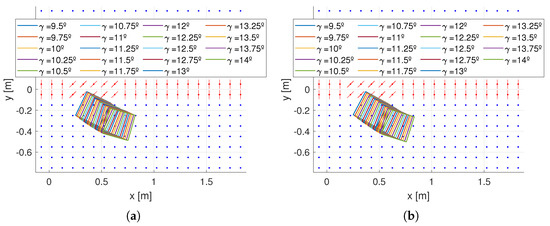 The second simulated application is the slowing activity. The rotor arrangement consists of a few modules within a line to create a controllable friction on the object to modulate its speed, without pushing it to the sides. The layout in this case can use rotors oriented with their axes in the direction of the flow () (Figure 6b) or inclined at in a row and in the other (Figure 6c).