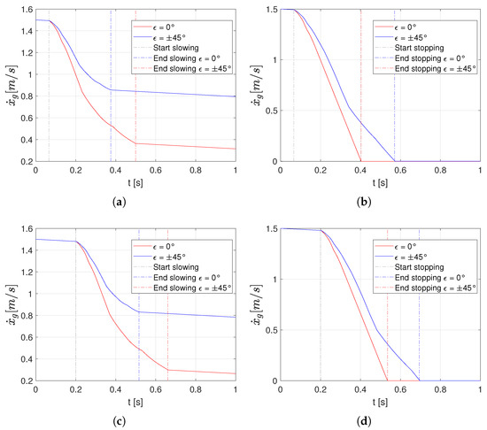 Layouts of the simulations for the slowing and the stopping tasks with: (a) “S-box” °, (b) “S-box” °, (c) “B-box” °, (d) “B-box” °.