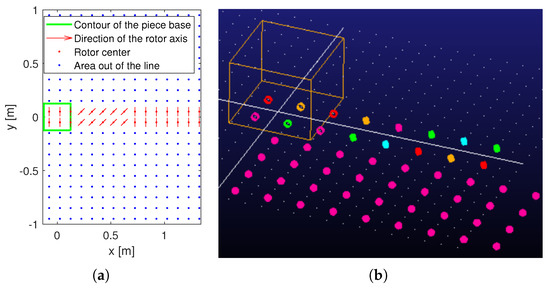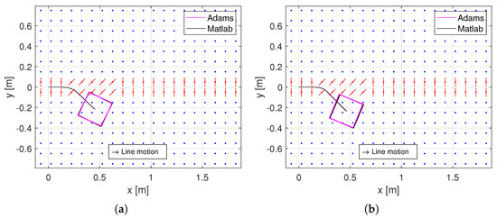The opposite sorting condition was tested as well; the only difference for the initial data was the direction of the rotors (°). The result is shown in Figure 7b and the trajectory is mirrored to the first one. In fact, as expected in reality, the ending displacements of the object are equal in modulus and with opposite sign for the y and displacements (Table 2).