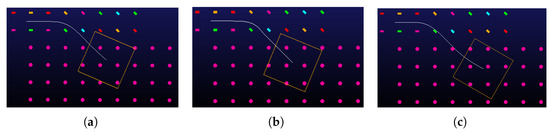 Examples of simulation layouts for: (a) sorting, (b) slowing or stopping with , and (c) slowing or stopping with .
