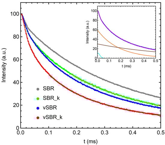 Expansion of the first 0.5 ms of the experimental 1H FIDs of the investigated samples at 303 K. The inset shows the experimental curve (blue) and the total fitting function (magenta) obtained for vSBR, together with the single contributions of the Gaussian (cyan), intermediate-T2 (orange), and long-T2 (brown) exponential functions.