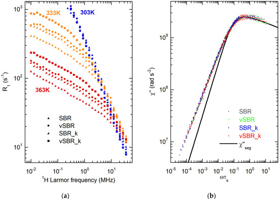 (a) 1H NMRD curves for the investigated samples at the indicated temperatures. (b) Susceptibility master curves of the indicated samples; the black line represents the contribution of the segmental dynamics to the χ′′(ωτs) master curve of SBR_k.