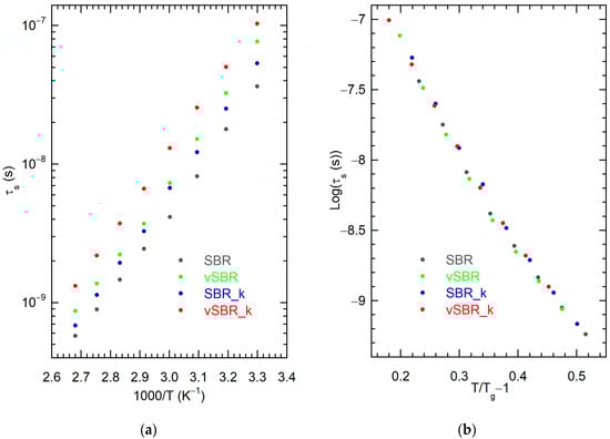 For each sample, the NMR susceptibility χ″(ω) curves obtained at different temperatures were combined together to build χ″(ωτs) master curves, under the assumption that the FTS principle holds true, to obtain τs values. χ″(ω) curves at 303 K were fitted to Equation (2) in order to obtain τs. βCD was found to be 0.12, in agreement with the value determined for SBR samples in a previous work [52]. At the remaining temperatures, τs values were determined as the frequency scaling factors used to build the master curves. The χ″(ωτs) master curves obtained for all samples are shown in Figure 3b, while the values of τs as a function of 1000/T are reported in Figure 4a. The obtained χ″(ωτs) master curves cover a frequency range of six decades and display characteristic shapes that well reflect the different dynamic regimes described above: at a high frequency, the contribution of segmental dynamics is dominant, while polymer dynamics assumes a significant importance for ωτs < 0.1.