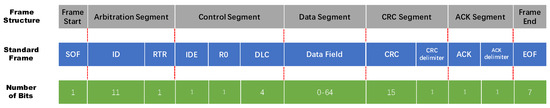 The composition and format of a standard CAN bus data frame are shown in Figure 1. The structure consists of seven segments: frame start, arbitration segment, control segment, data segment, cyclic redundancy check (CRC) segment, acknowledge character (ACK) segment, and frame end. The two segments that are most relevant to this paper are the arbitration and data segments.