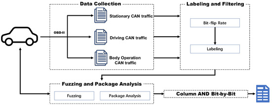 In order to fill the gaps in the previous work, this paper proposes an innovative technique to reverse body-related CAN messages based on labeled bits. This technique first tags and segments the CAN traces collected in different scenarios and filters out the body-related candidate messages based on tags related to the body behavior. After that, the valid messages corresponding to the automotive body behaviors are recorded using fuzzing and packet analysis techniques. Finally, the valid messages corresponding to each body behavior are executed AND OPERATION bit-by-bit to get the valid bits describing the automotive body behavior in CAN messages. The overall flow of the method described in this paper is shown in Figure 2.