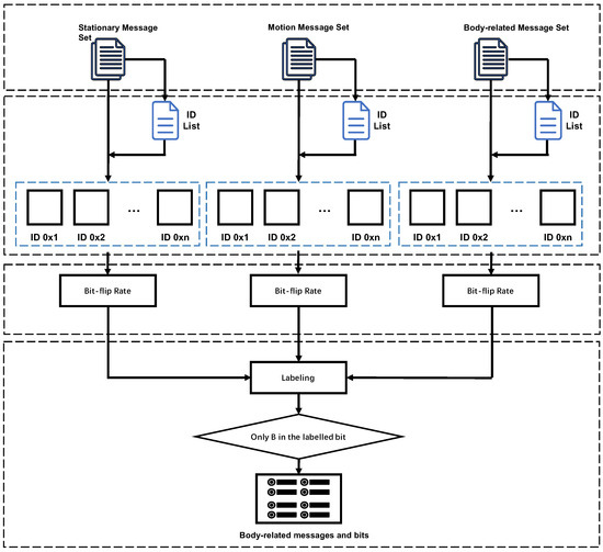 First, the valid IDs are extracted from each dataset, and the messages are grouped according to the IDs. Then, for each dataset grouped by ID, the message data fields are sorted by timestamps. After that, to quickly and efficiently filter CAN messages for body-related purposes, the bit flip rate is calculated for each message corresponding to each ID, and each bit is labeled based on the results of this calculation.