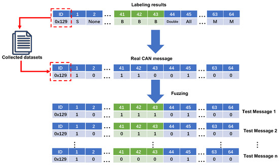 First, messages with data fields containing bits labeled B are used as base messages. The approach described in this paper utilizes the idea of fuzzy testing by fuzzifying the bits marked B in the base message. In contrast, the non-candidate bits are left unchanged from the original data, thus allowing the test message to be obtained. An example of test message generation is given in Figure 6. First, based on the tagging and message filtering results, the ID corresponding to the message with the B tag in the data field is found. A real CAN message corresponding to this ID is randomly selected from the obtained messages. Afterward, the bits marked with B are fuzzed (randomized or traversed) according to the message marking results. Finally, the bits not marked with B are left unchanged, and a set of test messages corresponding to this ID is generated. Once the set of test messages has been obtained, the test messages are sent sequentially to the vehicle’s CAN network via the OBD-II interface using the same cable combinations as used in the data collection phase. After each test message has been sent, we record each message that triggers the car’s behavior and the body response it triggers. After this operation, we can obtain candidate messages that can trigger a specific response from the vehicle.
