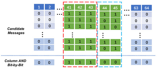 - After that, the values of the bits marked B in the data field of the candidate message undergo the column AND bit-by-bit process, and each data bit marked B is traversed. The control bits associated with the body operation have a value of 1, as shown for bits 41, 42, and 43 of each message in Figure 7. Unrelated bits have a value of 0; for example, bits 44 and 45 are shown in Figure 7;