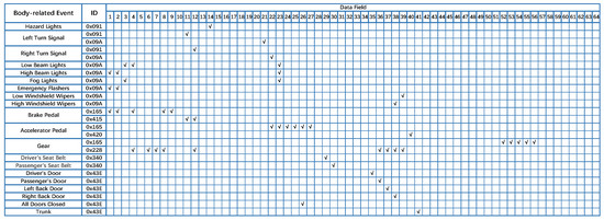 The data segment is the entire data field of the message and is 8 bytes in size. This short frame structure gives the CAN a high degree of real-time and interference immunity. The data field contains the control commands or status data sent by the ECU, thus enabling the different ECUs to work together to ensure the proper operation of the vehicle. In practice, the data fields are defined differently for each ID. For example, bits 9 to 12 of the data field corresponding to the message ID 0x100 are defined as data related to the lights, while bits 9 to 12 of the data field corresponding to the message ID 0x120 are related to the doors. These definitions are determined entirely at the discretion of the vehicle manufacturer and are non-public. The method described in this paper aims to quickly obtain the definition of the body state in the CAN message.