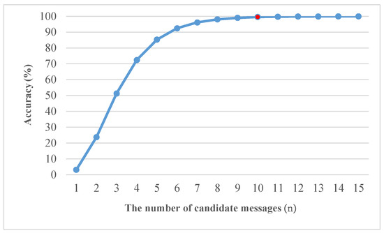 When undergoing the AND bit-by-bit process, the method described in this paper can translate vehicle body behaviors using just 10 candidate messages. In the case that the number of candidate messages is n, if the probability of any bit in the data field is set to 1 is p, the probability of the irrelevant bit AND bit-by-bit resulting in 0 is . Then the correct rate at this point is (where m is the number of irrelevant bits). During our experiments, we calculated that the maximum number of potential body data bits in the data field of 12. However, a more extreme value of 20 bits was used to verify the accuracy, and it was assumed that only 15 bits were valid (which also means that 5 bits are actually not body-related). Since these are independent, we considered the value of P to be 0.5. Figure 9 showed an accuracy of 99.5% when n was 10 for the assumed extreme case. In actual vehicle experiments, the bit-tagging method in this paper would not result in m being greater than 5, so the accuracy would be higher in the actual case.