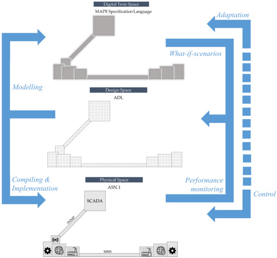 Additional concepts that could be used are related to the technology classification. The Remote Monitoring Management information base (RMON MIB) (1 and 2) [59] offers a tree-like structure and this is a highly useful approach for the current case. Additionally, it is mentioned that concepts such as object-oriented modelling [60], Process Specification Language (PSL) and Unified Modeling Language (UML) [61], as well as languages such as “Monitor-Analyze-Plan-Execute over a shared Knowledge” (MAPE-K) [62] can be used at different phases of a digital twin (operation and design), while the concept of orchestration [63] is highly relevant. Additionally, the need for integrating the key enabling technologies (KETs) into the design process of manufacturing systems [64] and the corresponding orchestration could be enhanced through the use of a BPMN structure, while an alternative approach, that of service-based manufacturing systems [65], could be integrated. The lack of an overall framework though is evident. Figure 2 illustrates this issue, by representing different phases of manufacturing where a metamodel could be used. The interactions between the phases are also shown.