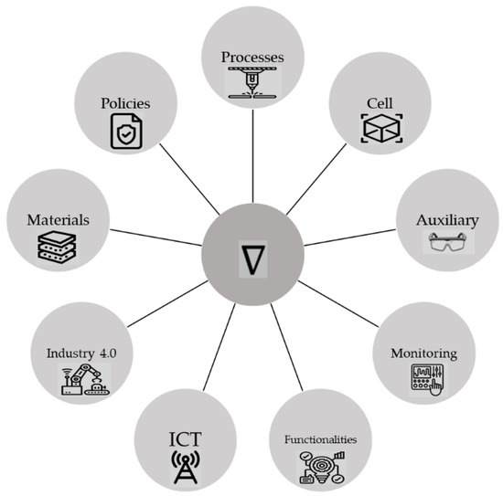 To address all the strategies imposed by the social and environmental requirements, novel manufacturing technologies have rapidly emerged over the last decade, establishing their position in the manufacturing sector [66]. Prior publications have focused on the enabling technologies in the concept of Industry 4.0 (or even Industry 5.0) and the subcategories of these. The current work expands on this approach by investigating the integration of the nine attributes, namely the processes, the cell, the auxiliary functions, monitoring/control, manufacturing functionalities, ICTs, Industry 4.0, materials and policies on a small–medium enterprise (SME) or original equipment manufacturer (OEM) environment with respect to the environmental footprint.
