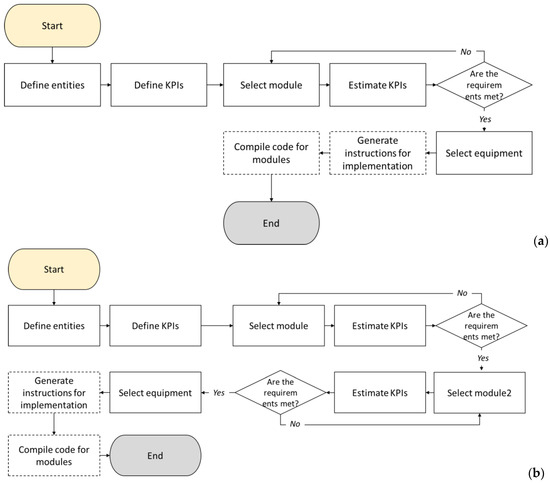 This would lead an engineer to utilize predefined workflows. As a matter of fact, an automation workflow knowledge database could be formed. For the two different expressions mentioned above, one could choose the workflow they desire (through flowcharts in this case, as shown in Figure 5). The choice is dependent on the environment, the ease of access to technologies and skills, the business policies and the implementation time, as well as the cost [101]; thus, per case, this allows for the integration of human-in-the-loop selection or an automated one. This way, based on feasible workflows, one can overcome the “cost” of an optimization that would have doubtful actual profit for a business.