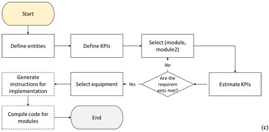 The second step of the automation of the workflow is to transcribe this to a flowchart. For instance, function (module, criteria ^ constrains) is straightforward, as it refers to one loop (Figure 5a). The module selection is an iterative procedure, where various candidate technologies can be checked against the criteria set. However, function2 ((module1, module2), criteria) has at least two implementations (i.e., Figure 5b,c). The first one is related to the sequential selection of the modules, while the second is about the simultaneous choice of the two modules.