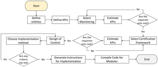 The pseudo-mathematical description in this case would be optimize (Certify (Optimize (monitoring (Laser Welding), with respect to cost and efficiency)),with respect to data). The corresponding traditional workflow would then be as per the following image (Figure 6). The first loop implies the sequential choice of alternatives for the equipment that is available and the evaluation. An immediate conclusion of this workflow would be the rejection of thermal cameras and a focus on pyrometers, due to the cost and data rate. Then, once the equipment is fixed, the certification mechanism has to be finalized. Under the requirement of a non-data-intensive approach [85], a mechanism for data abstraction is required. Then, it is time for the choice of implementation. In the case where Unified Architecture of Open Platform Communications (OPC-UA) communication [110] is required, then there may be restrictions for the sampling rate. Thus, this implies that a controller has to be designed before the implementation design. For instance, a bang-bang controller, with a low on–off rate, may have to be used in this case instead of a traditional one (i.e., PID [111]).