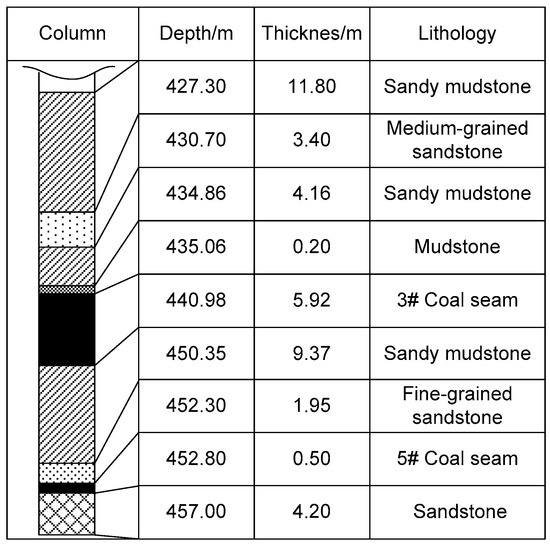 The false roof of the coalface is a grayish black mudstone layer with thickness of 0.2 m, which is soft and falls off with mining. The immediate roof is a gray–black sandy mudstone layer with a thickness of 4.16 m, containing plant fossils. The basic roof is a dark gray medium-grained sandstone layer with a thickness of 3.4 m. The immediate bottom is a gray–black sandy mudstone layer with a thickness of 9.37 m, containing plant fossils. The basic bottom is a fine-grained sandstone layer with thickness of 1.95 m, and it is partly sandwiched with thin sandy mudstone (Figure 2).