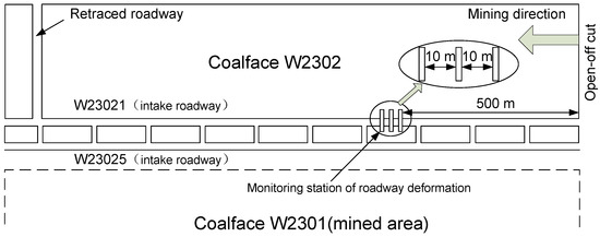 The coalface W 2302 used a “three-in and two-out” roadway layout. There are five mining roadways in total (Figure 1): W 23021, W 23025, W 23023 are intake roadways, and W 23022, W 23024 are ventilation roadways. Roadways W 23021 and W 23025 were reused roadways. They were retained after the mining of coalface W 2301 (last coalface). The roadways all have a rectangular cross section with a size of 5.0 m × 3.8 m. This paper takes roadway W 23021 as the research object.