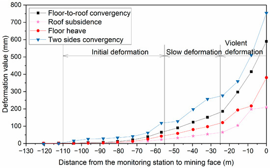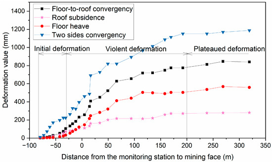 It can be found from Figure 5 that the roadway deformation curves during the first mining operation are characterized by significant lagging stable deformation, which means a permanent deformation is achieved only after coalface has advanced and passed a long distance. The two sides’ convergency was greater than the floor-to-roof convergency. The roadway deformation can be divided into three stages: ① initial deformation stage. The range is from 80 m to 30 m ahead of the coalface (−80~−30 m). The roadway was in the stage of slight deformation, during which the plastic zone of roadway begins to evolve. ② Violent deformation stage. The range was from 30 m ahead of the coalface to 200 m behind the coalface (−30~200 m). The overlying strata of the caving zone fell down during mining and formed goaf. The overlying strata in the goaf only rely on the coal pillars on both sides, which led to the increased stress in the coal pillars and the sharply increased in the deformation and velocity value of roadway. The roadway deformation velocity was the greatest in this process, and the floor heave and sidewall convergency phenomena are serious. ③ Plateaued deformation stage. The range was from 200 m to 320 m behind the coalface (200~320 m). The roadway deformation velocity decreased. The roadway deformation tends to be stationary due to gradually stabilized goaf. The maximum of two sides’ convergency was about 1200 mm, and the maximum of floor-to-roof convergency was about 820 mm.