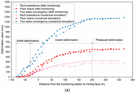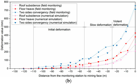 In order to analyze the influence of two mining operations, the roadway deformation due to initial gravitational settling was firstly recorded and then the additional deformations due to coalface advancing were calculated step by step. The coalface advanced 10 m every time. The deformation curves are shown in Figure 8 and compared with the field monitoring results.