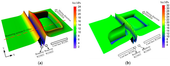 The reused roadway suffered two mining operations, so the analysis should be in a dynamic view [41]. According to the field monitoring and mine pressure theory, roadway W 23021 was reserved on the side of goaf and suffered the lateral abutment pressure during the first mining (coalface W 2301). During the second mining, roadway W 23021 became deformed ahead of coalface W 2302 and was abandoned up to behind it, so the roadway W 23021 suffered the leading abutment pressure. The 3D contours of the vertical stress of the coal seam are shown in Figure 9, and the vertical stress contours of monitoring section during the two mining operations are shown in Figure 10 and Figure 11.
