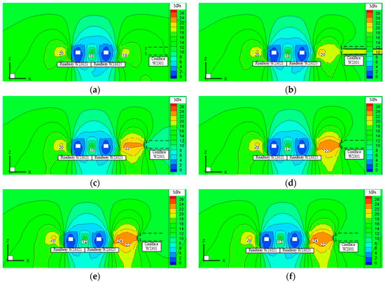 Vertical stress contours of monitoring section during the first mining. (a) 50 m ahead of coalface W 2301; (b) 0.5 m behind coalface W 2301; (c) 50 m behind coalface W 2301; (d) 100 m behind coalface W 2301; (e) 150 m behind coalface W 2301; (f) 200 m behind coalface W 2301.