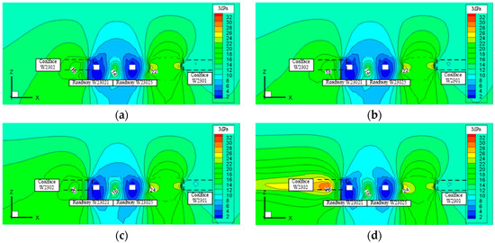 Vertical stress contours of monitored section during the second mining. (a) 100 m ahead of coalface W 2302; (b) 70 m ahead of coalface W 2302; (c) 40 m ahead of coalface W 2302; (d) 10 m ahead of coalface W 2302.